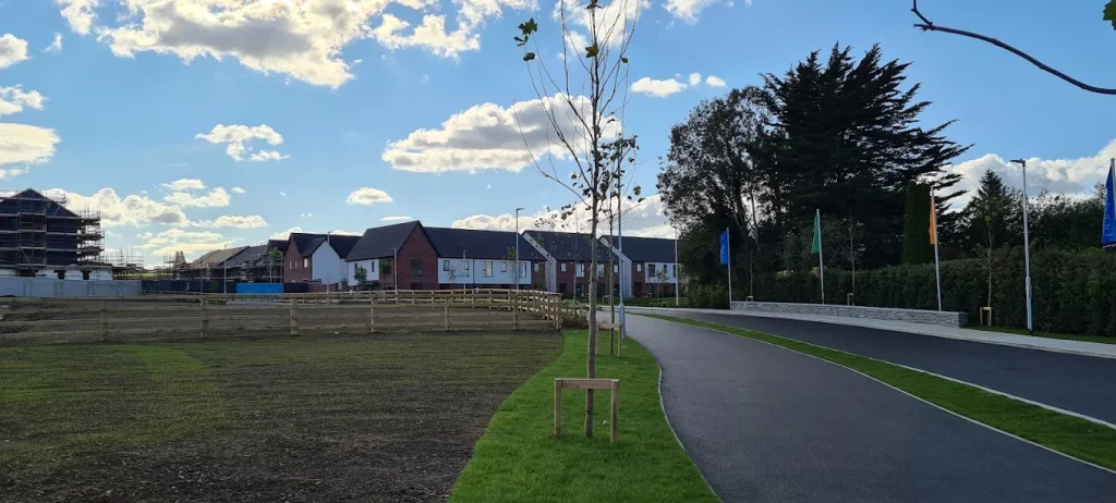 The c.17.5-hectare development includes 377 units, consisting of 255 houses and 122 apartments and duplexes. It features amenities such as a crèche, a retail unit, parks, green links, and cycle routes.